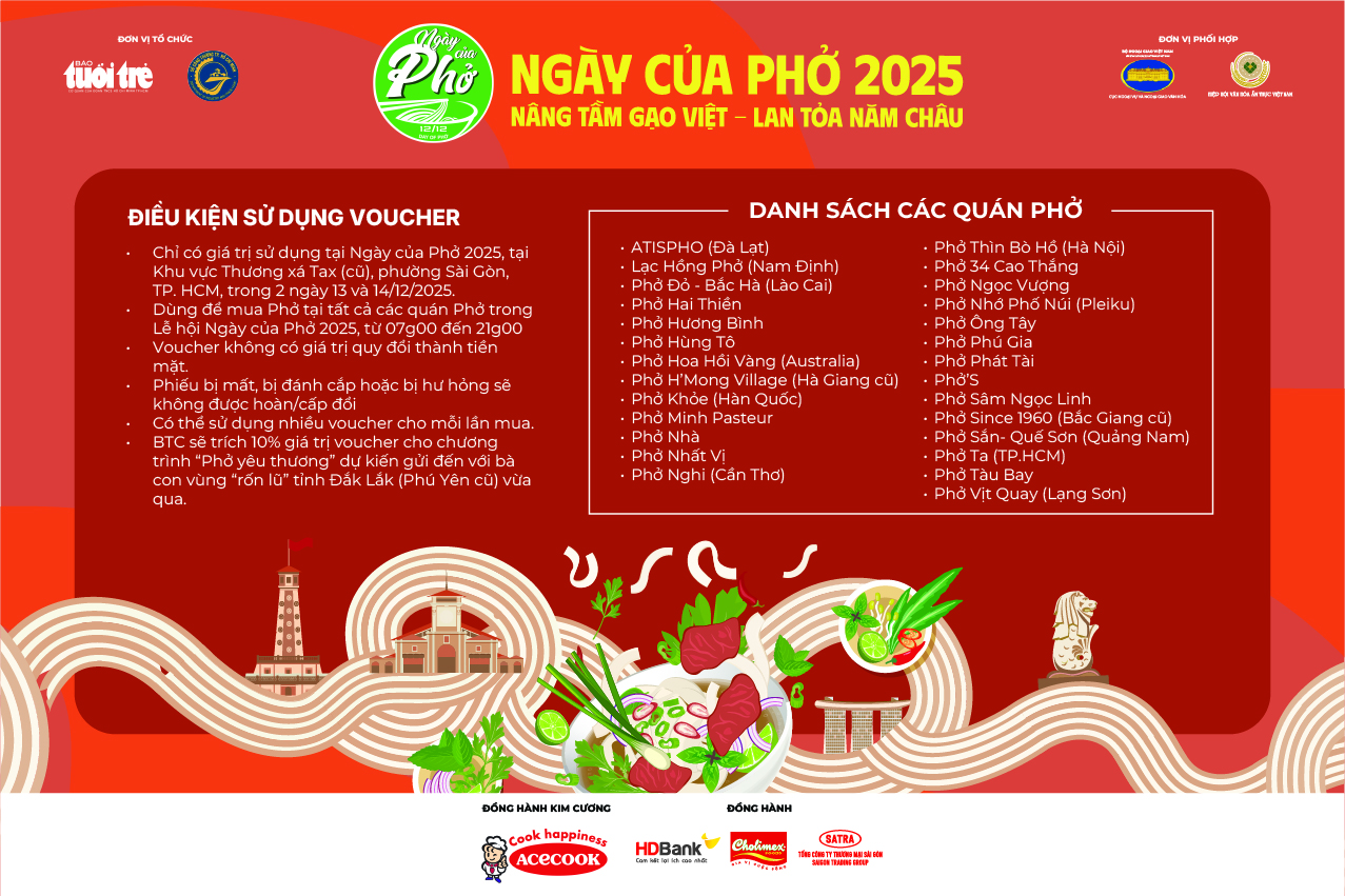 100 bạn đọc tham gia đăng ký trước và checkin sớm tại sự kiện để có cơ hội nhận voucher thưởng thức phở miễn phí của gần 30 thương hiệu nổi tiếng toàn quốc . Hoặc nhận các phần quà giá trị khác của sự kiện được tổ chức vào 13-14/12/2025 tại Thương xá Tax (cũ), 135 Nguyễn Huệ, Phường Sài Gòn, TP.HCM